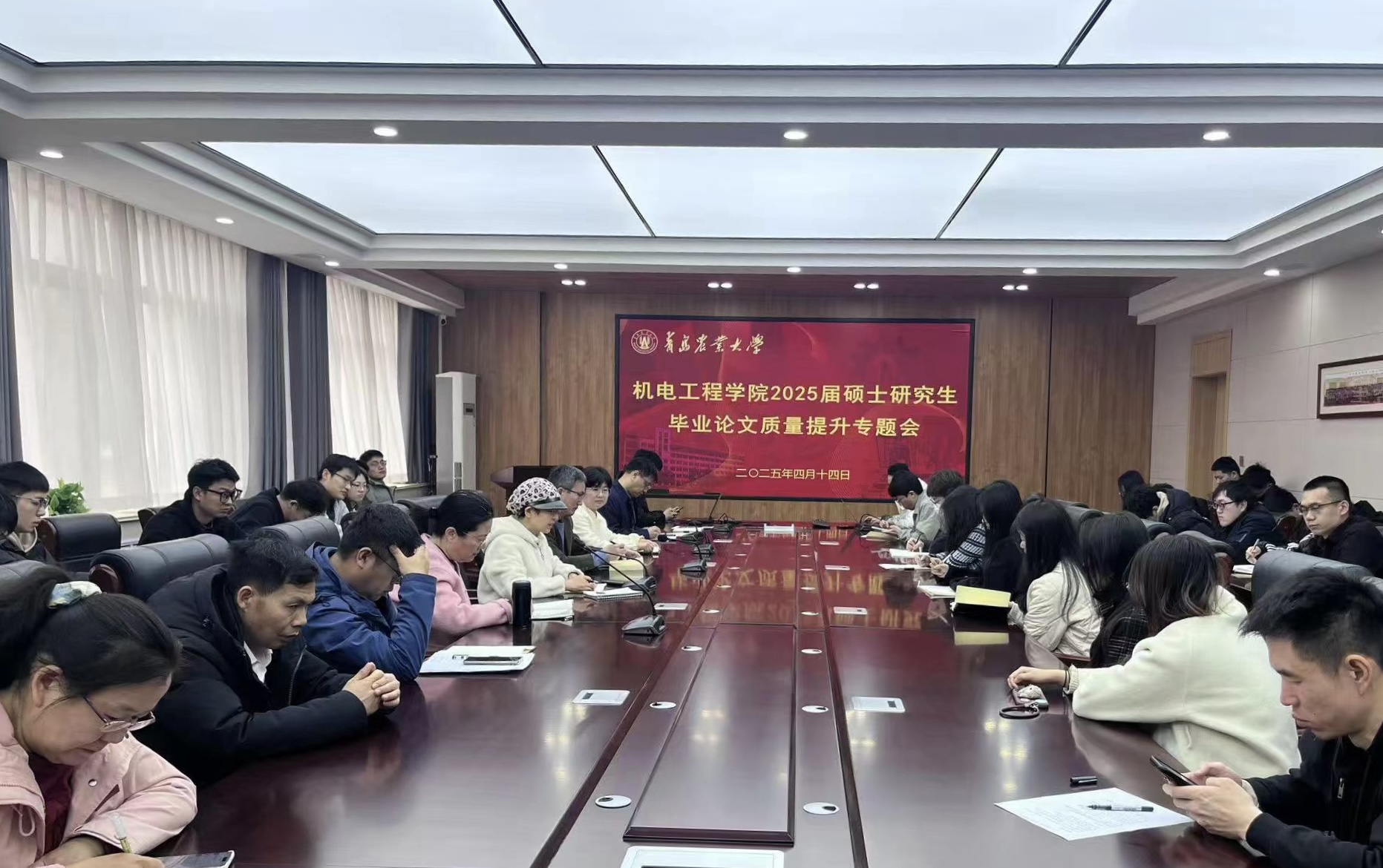 会上,王家胜强调了提升研究生论文质量的相关要求和重要性,明确从选题论证、实验数据规范、论文查重到盲审答辩的全流程实施细则。随后,研究生导师代表王宝超教授、李娟教授、胡彩旗教授、张瑞副教授分别从学术诚信、论文逻辑、实质性内容、撰写细节和创新点等方面对大家做了进一步讲解和指导。最后,焦磊作总结讲话。他强调:一是强化导师责任制,导师全程跟进学生论文选题、开题、中期检查及答辩等环节;二是完善质量监控体系,建立“学院—学位分委会—导师组”三级联动机制,定期开展论文质量评估;三是注重学术创新导向,鼓励学生结合国家重大战略需求与学科前沿问题开展研究,提升论文的学术价值与社会应用价值。