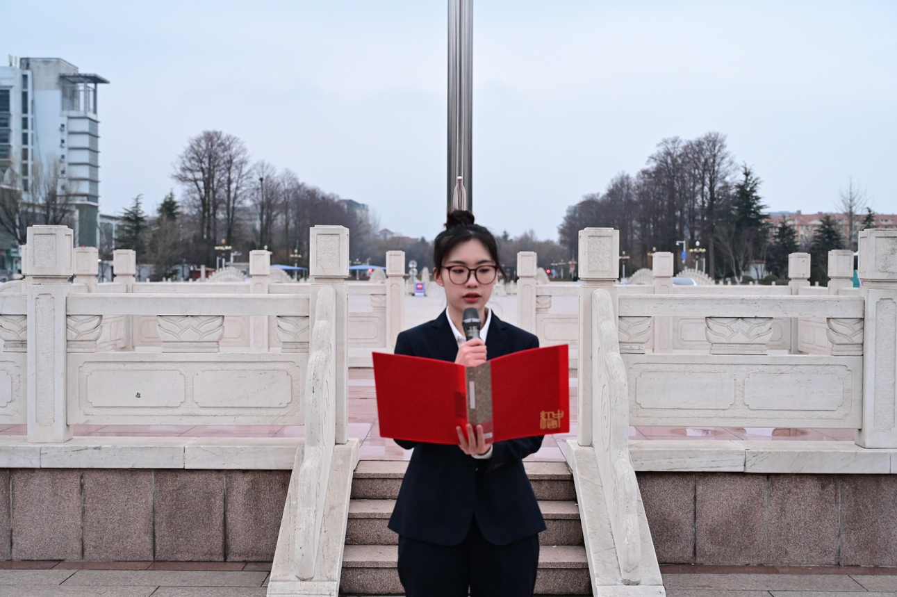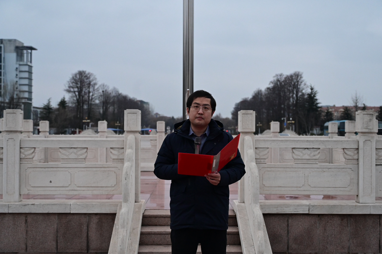 迎着初升的太阳,迈着铿锵的步伐,校国旗护卫队雄赳赳、气昂昂护送五星国旗入场。随着《义勇军进行曲》奏响,鲜红旗帜冉冉升起,全体师生庄严肃立,齐唱中华人民共和国国歌。升旗礼毕,学院优秀学生代表张俊晗进行国旗下演讲,她以“赓续红色基因,青年挺膺担当”为主题,结合自己的所学、所感、所想,号召青年学生作为新时代的生力军,肩负着传承红色基因的重要使命,应积极担当作为,赓续精神血脉,让红色基因薪火相传。仪式最后,辅导员刘一江作总结讲话,他向同学们提出以下三个方面的期望:一是坚定理想信念,锤炼高尚品格;二是勤奋学习求知,提升综合能力;三是勇担时代重任,展现青春担当。他强调,青年人要不断坚定远大抱负、坚定理想信念,把个人的梦想同伟大的中国梦紧密联系在一起,做有历史责任感、志存高远的时代新人。