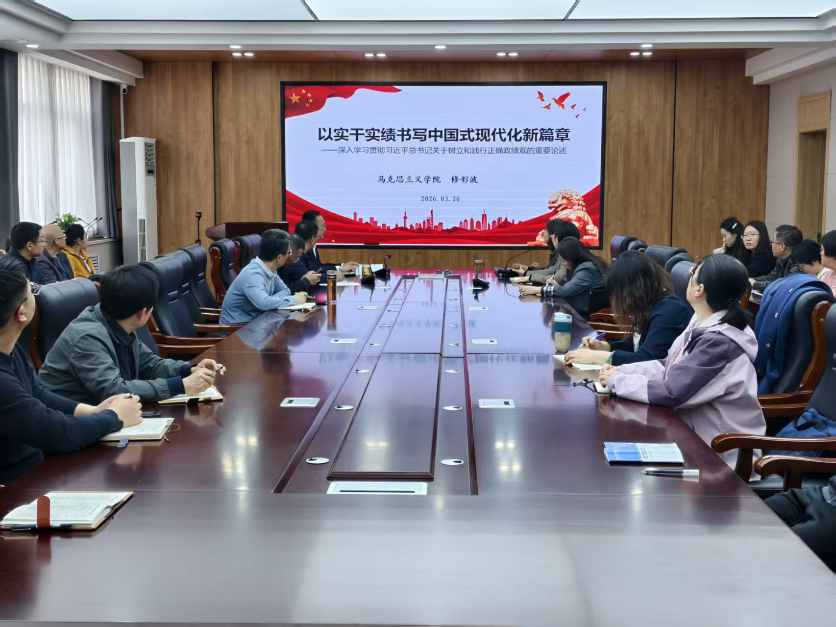 修彩波的专题报告从“政绩为谁而树、树什么样的政绩、靠什么树政绩”这一根本问题切入,重点阐述了树立和践行正确政绩观的重大意义和丰富内涵,围绕“为民、为党、为国”的价值导向,深入浅出地向大家解释了如何处理好党性与个性、显绩与潜绩、权力与责任、干净与干事等关键关系,引导学院党员干部在实干中践行正确政绩观,以始终坚守人民立场为取向、以始终坚持实事求是的思想路线为遵循、以进一步纠治形式主义和官僚主义为保障、以坚持一张蓝图干到底为定力,为学校高质量发展贡献力量。