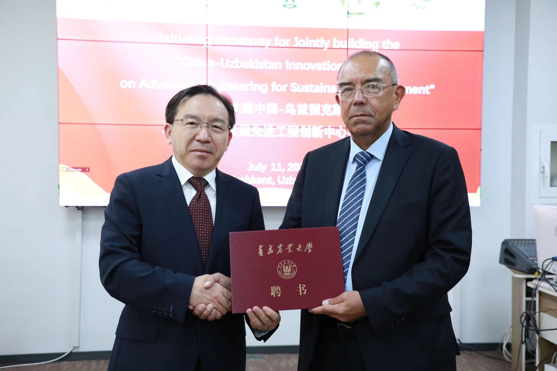 启动仪式上,双方签署了中心共建协议,共同为“中国—乌兹别克斯坦农业可持续发展先进工程创新中心”揭牌。赵金山为阿利姆·普拉托夫颁发了William威廉客座教授聘书。