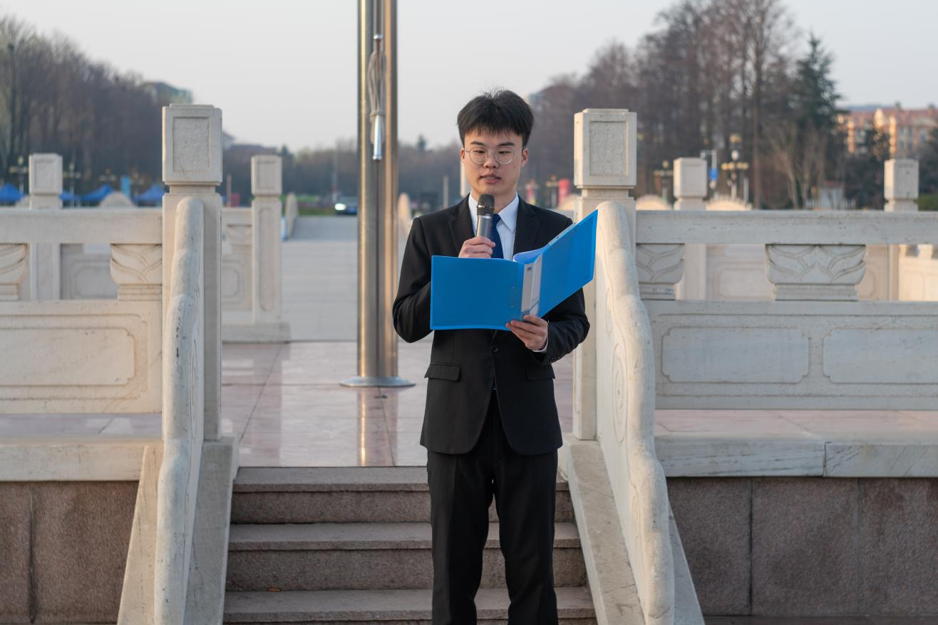 6点10分,仪式开始。旗杆前,国旗护卫队迈着铿锵有力的步伐,气宇轩昂地走向升旗台。在虹子广场上,伴随着雄壮的《义勇军进行曲》,鲜艳的五星红旗冉冉升起,全院师生庄严肃立,齐唱国歌,面向国旗行注目礼。国旗下,2021级农业机械化及其自动化(创新实验班)2101班于曰皓发言,他回顾了参加全国大学生过程装备实践与创新大赛的获奖历程,并给大家分享三点建议:一是明确学习目标,制定详细计划,争做信念坚定、理想远大的人;二是参与科创赛事,提升科创能力,争做刻苦学习、锐意创新的人;三是深入了解基层,关注三农发展,争做艰苦奋斗、无私奉献的人。仪式最后,辅导员李奇作总结讲话,她回顾过去一年来学院创新创业方面取得的成绩,并从以下三个方面勉励学院学生,一是秉持“兴趣驱动、自主实践、重在过程”的原则,牢记使命担当,推进科创融合;二是要以“我敢闯、我会创”的韧劲和执着,将强农兴农的誓言扛在肩上,落在脚下;三是以昂扬向上的朝气、敢为人先的锐气,成为新时代奋勇前进的搏击者,将科创梦想融入伟大的中国梦。