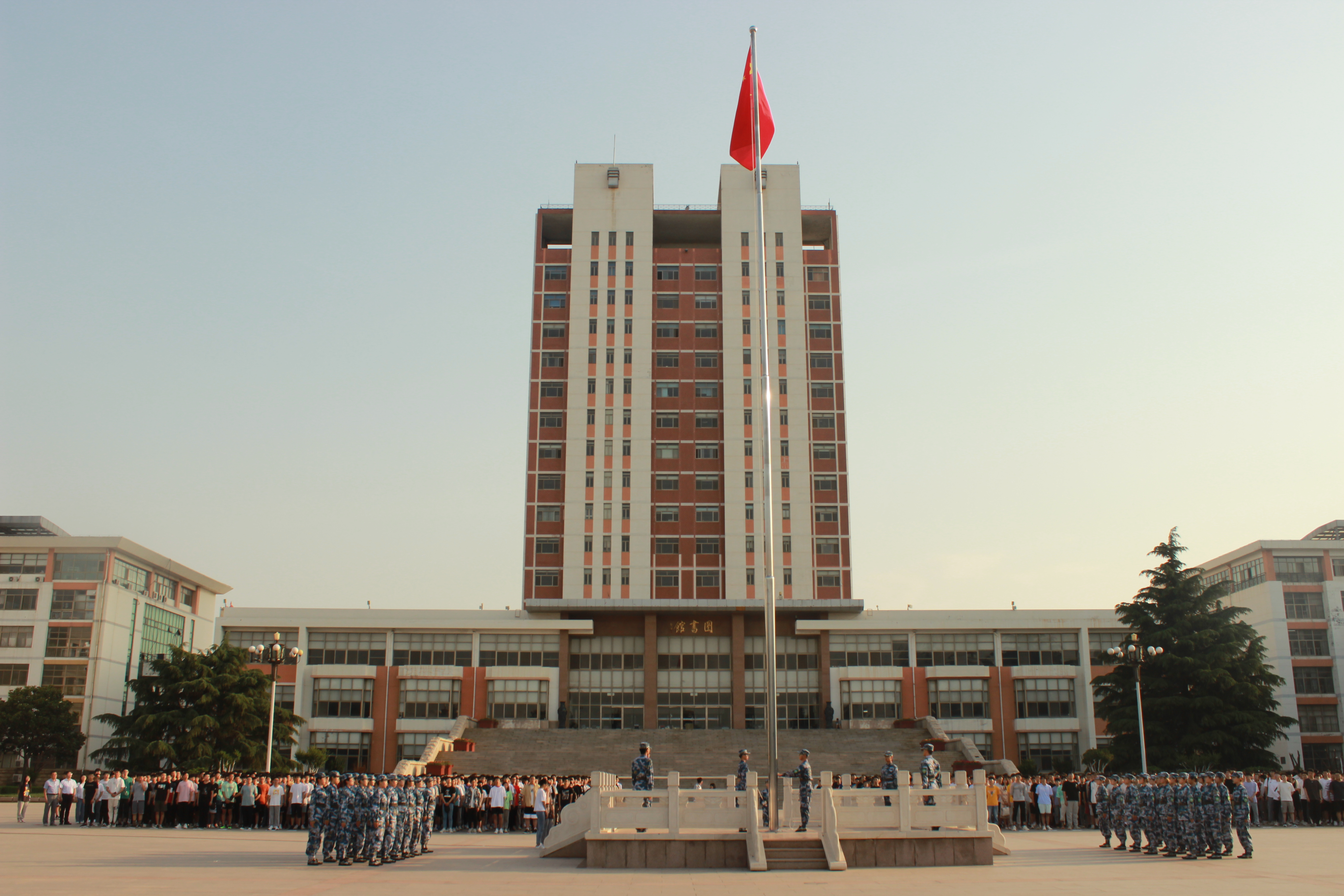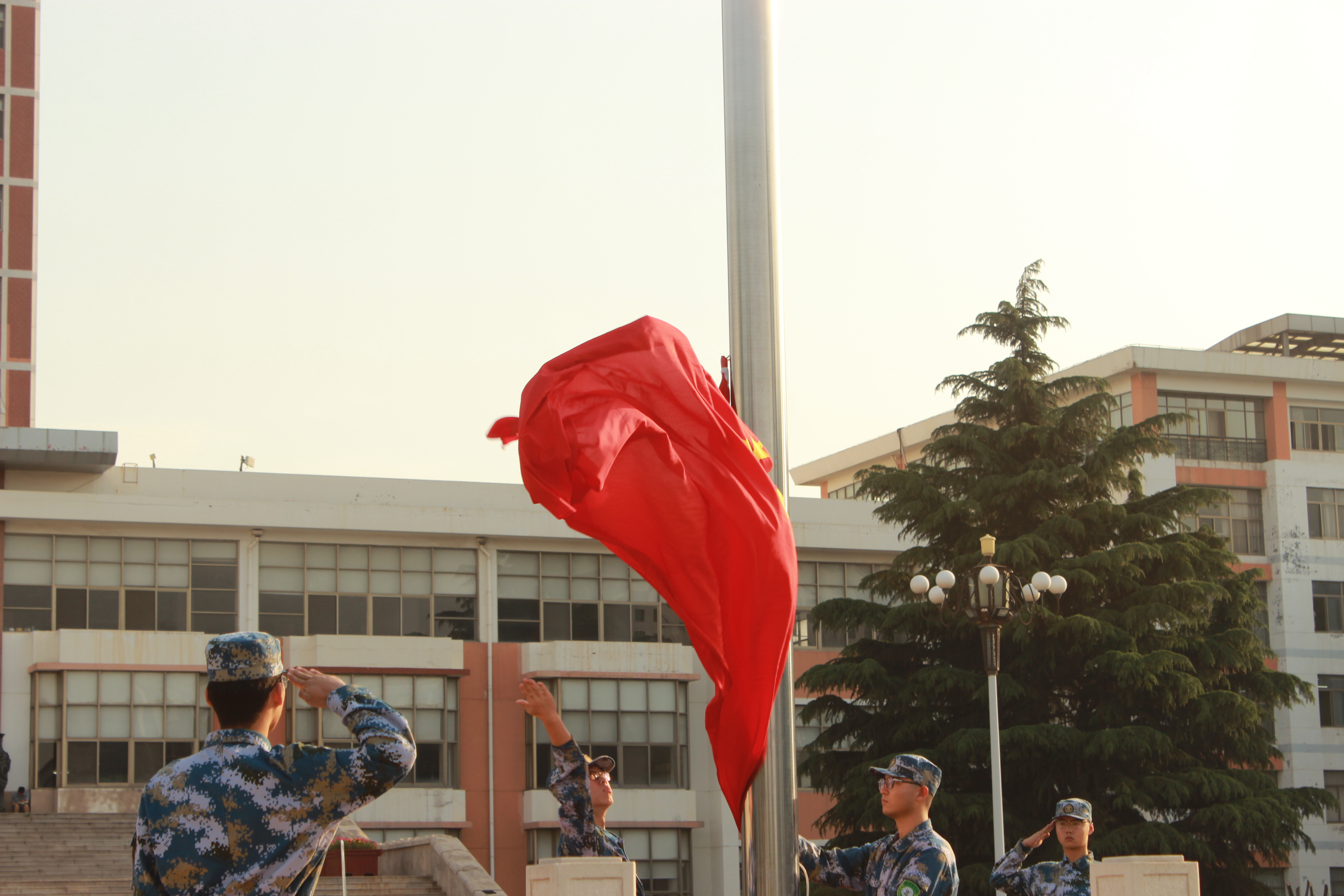 迎着朝阳,校国旗护卫队迈着坚定的步伐,护送鲜艳的五星红旗庄严入场。奏响雄壮的《义勇军进行曲》,鲜艳的五星红旗冉冉升起。全体师生面向国旗行注目礼,点燃了在场师生满腔炽热的爱国之情。